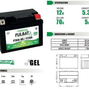 Gracias a su diseño 100% sellado (VRLA), la batería FTX4L-BS / FTZ5S GEL es ideal para todos los deportes de motor que requieren un alto rendimiento.
