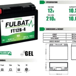 Fulbat batería YT12B-4 Gel ( 550643 ) forma parte de nuestra gama GEL. Diseñada específicamente para ofrecer el máximo rendimiento, esta batería de 12V 10,5Ah está lista para usar y no requiere ninguna manipulación de ácido, preparación inicial o mantenimiento.