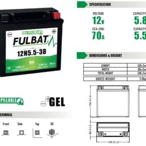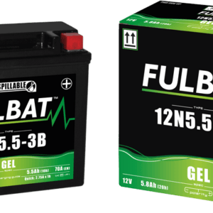 Fulbat batería 12N5,5-3B Gel ( 550980 ) forma parte de nuestra gama GEL. Diseñada específicamente para ofrecer el máximo rendimiento, esta batería de 12V 5,8Ah está lista para usar y no requiere ninguna manipulación de ácido, preparación inicial o mantenimiento.