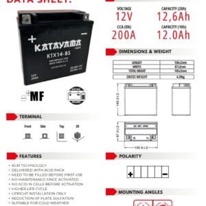 La batería YTX14-BS está 100% sellada y no necesita mantenimiento una vez activada, lo que mejora su vida útil y su resistencia a las condiciones más duras.