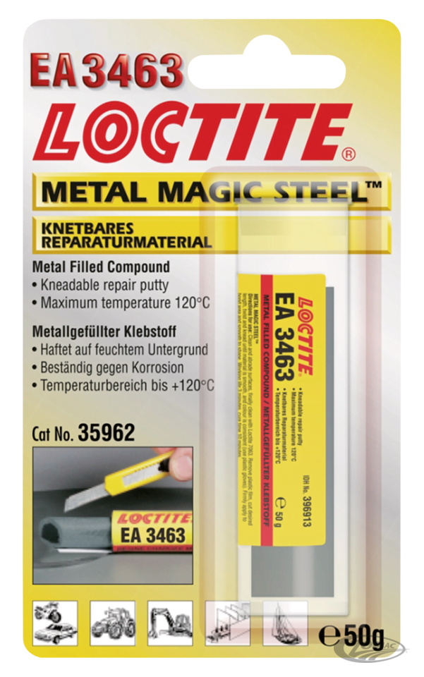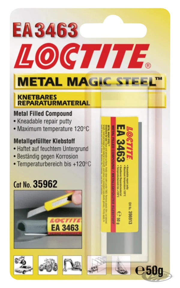 LOCTITE® 3463 es un versátil epoxi bicomponente con carga de acero para reparaciones. Se aplica como una masilla y cuando está completamente curado presenta alta resistencia a la compresión y buena adhesión a la mayoría de las superficies. Este producto para las fugas en tuberías y tanques y repara pequeños defectos en alojamientos y orificios mecanizados de entrada de tornillos y espárragos, bloque motor, etc. Este producto se utiliza habitualmente en aplicaciones con un intervalo térmico operativo de entre -30 °C a +121 °C.