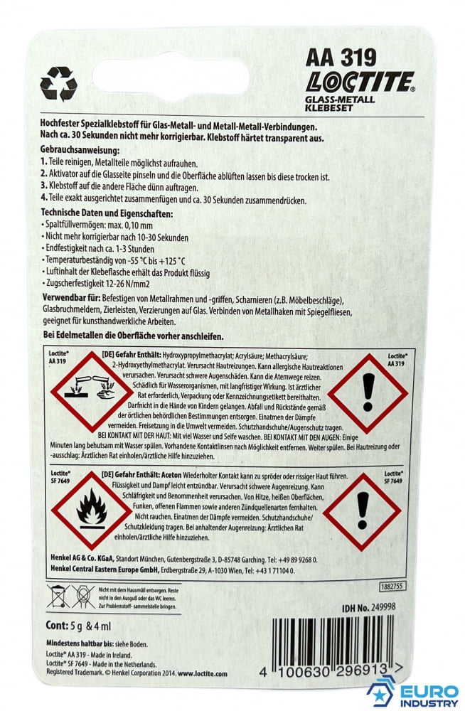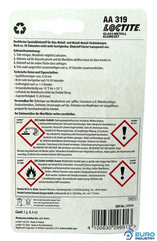 LOCTITE® 319 es un adhesivo acrílico monocomponente que ofrece soluciones de adhesión estructural para materiales tales como metales, vidrio, cerámica y plásticos. Algunas de sus aplicaciones típicas incluyen la adhesión de espejos retrovisores a la luna. Compensa la diferencia de expansión térmica de las piezas para asegurar un curado rápido y fiable se debe utilizar la malla con el activador que contiene el kit.