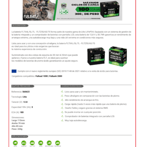 Fulbat batería FLTZ5S 180A.( 560622 ) FLTX4L/5L/7L – FLTZ5S/6S/7S forma parte de nuestra gama de Litio LiFePO4. Equipada con un sistema de gestión de la batería integrado y un comprobador de baterías con pantalla LCD, esta batería de 12,8 V y 38.7Wh garantiza un rendimiento de arranque extremo, una auto descarga muy baja y una vida útil extrema en condiciones más seguras.