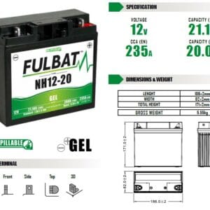 Fulbat batería NH12-20 Gel ( 550917 ) forma parte de nuestra gama GEL. Diseñada específicamente para ofrecer el máximo rendimiento, esta batería de 12V 21,1Ah está lista para usar y no requiere ninguna manipulación de ácido, preparación inicial o mantenimiento.