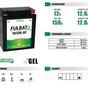 La batería de Fulbat YB12AL-A2 GEL ( 550926 ) forma parte de nuestra gama GEL. Diseñada específicamente para ofrecer el máximo rendimiento, esta batería de 12V 12,6Ah está lista para usar y no requiere ninguna manipulación de ácido, preparación inicial o mantenimiento.
