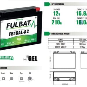 La batería de Fulbat YB16AL-A2 GEL ( 550948 ) forma parte de nuestra gama GEL. Diseñada específicamente para ofrecer el máximo rendimiento, esta batería de 12V 16,8Ah está lista para usar y no requiere ninguna manipulación de ácido, preparación inicial o mantenimiento.