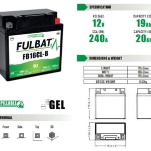 Fulbat batería YB16CL-B GEL ( 550979 ) forma parte de nuestra gama GEL. Diseñada específicamente para ofrecer el máximo rendimiento, esta batería de 12V 20Ah está lista para usar y no requiere ninguna manipulación de ácido, preparación inicial o mantenimiento.
