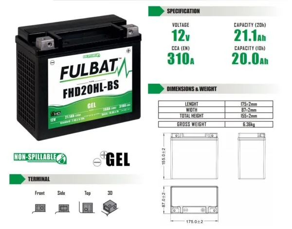 Fulbat batería YHD20HL-BS Gel ( 550881 ) forma parte de nuestra gama GEL. Diseñada específicamente para ofrecer el máximo rendimiento, esta batería de 12V 21,1Ah está lista para usar y no requiere ninguna manipulación de ácido, preparación inicial o mantenimiento.