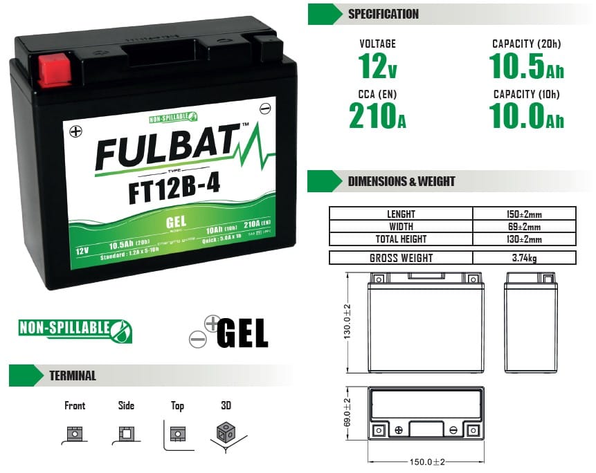 Fulbat batería YT12B-4 Gel ( 550643 ) forma parte de nuestra gama GEL. Diseñada específicamente para ofrecer el máximo rendimiento, esta batería de 12V 10,5Ah está lista para usar y no requiere ninguna manipulación de ácido, preparación inicial o mantenimiento.