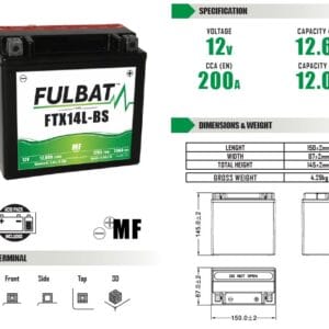 La batería FTX14L-BS está 100% sellada y no necesita mantenimiento una vez activada, lo que mejora su vida útil y su resistencia a las condiciones más duras.