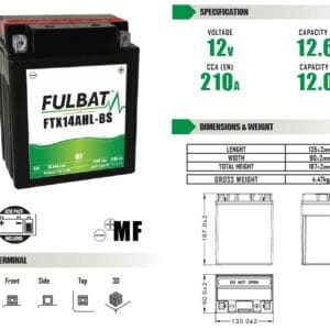 Fulbat batería FTX14AHL-BS ( 550607 ) forma parte de nuestra gama sin mantenimiento. Especialmente diseñada para ofrecer más comodidad y rendimiento, esta batería de 12V y 12,6Ah viene con un pack de ácido y debe ser activada antes del primer uso.