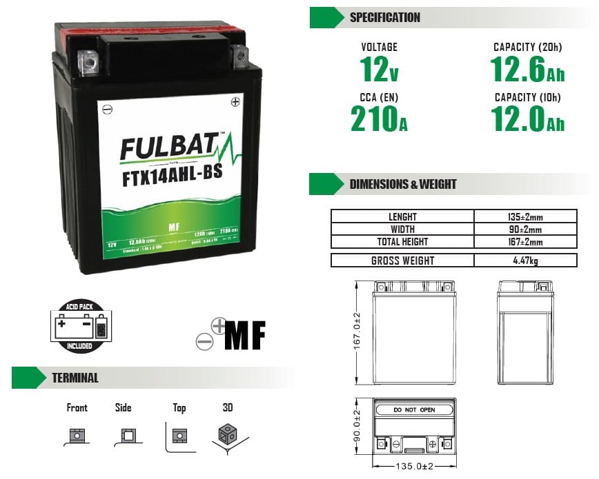 Fulbat batería FTX14AHL-BS ( 550607 ) forma parte de nuestra gama sin mantenimiento. Especialmente diseñada para ofrecer más comodidad y rendimiento, esta batería de 12V y 12,6Ah viene con un pack de ácido y debe ser activada antes del primer uso.