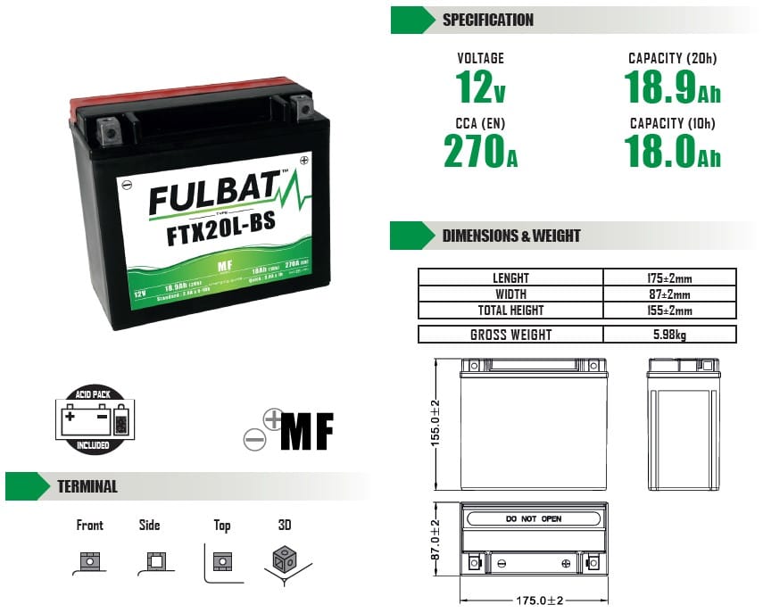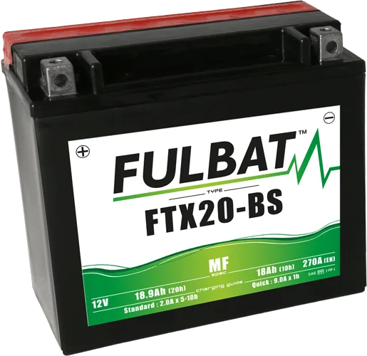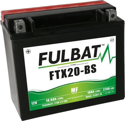 Fulbat batería FTX20-BS MF ( 550611 ) forma parte de nuestra gama sin mantenimiento. Especialmente diseñada para ofrecer más comodidad y rendimiento, esta batería de 12V y 18,9Ah viene con un pack de ácido y debe ser activada antes del primer uso.