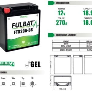 Fulbat batería FTX20A-BS Gel ( 550994 ) forma parte de nuestra gama GEL. Diseñada específicamente para ofrecer el máximo rendimiento, esta batería de 12V 18,9Ah está lista para usar y no requiere ninguna manipulación de ácido, preparación inicial o mantenimiento.