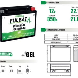 Fulbat batería FTX24HL-BS Gel ( 550982 ) forma parte de nuestra gama GEL. Diseñada específicamente para ofrecer el máximo rendimiento, esta batería de 12V 22,1Ah está lista para usar y no requiere ninguna manipulación de ácido, preparación inicial o mantenimiento.