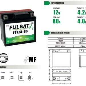 Fulbat batería FTX5L-BS MF ( 550618 ) forma parte de nuestra gama sin mantenimiento. Especialmente diseñada para ofrecer más comodidad y rendimiento, esta batería de 12V y 4,2Ah viene con un pack de ácido y debe ser activada antes del primer uso.