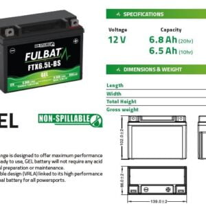 Gracias a su diseño 100% sellado (VRLA), la batería Fulbat FTX6.5L-BS Gel ( 550963 ) es ideal para todos los deportes de motor que requieren un alto rendimiento.