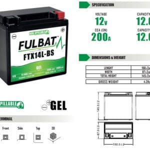 Gracias a su diseño 100% sellado (VRLA), la batería FTX14L-BS GEL es ideal para todos los deportes de motor que requieren un alto rendimiento.