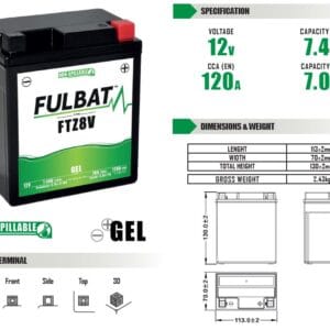 Fulbat batería YTZ8V Gel ( 550918 ) forma parte de nuestra gama GEL. Diseñada específicamente para ofrecer el máximo rendimiento, esta batería de 12V 7,4Ah está lista para usar y no requiere ninguna manipulación de ácido, preparación inicial o mantenimiento.