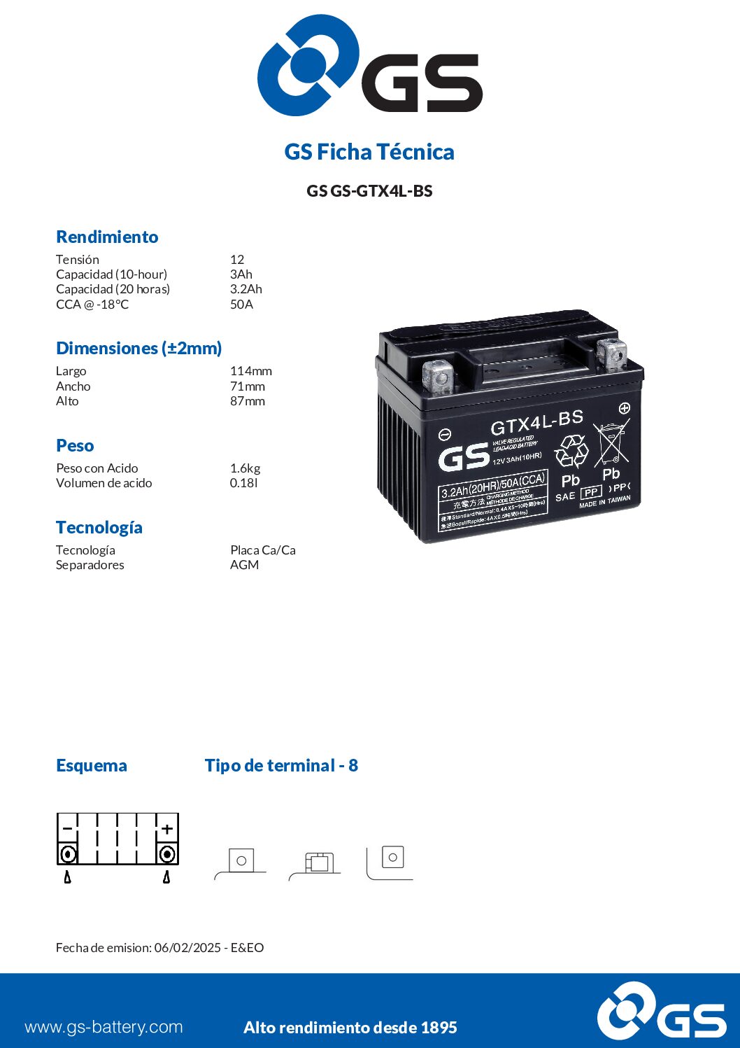 GS YTX4L-BS, batería sin mantenimiento, tipo AGM.