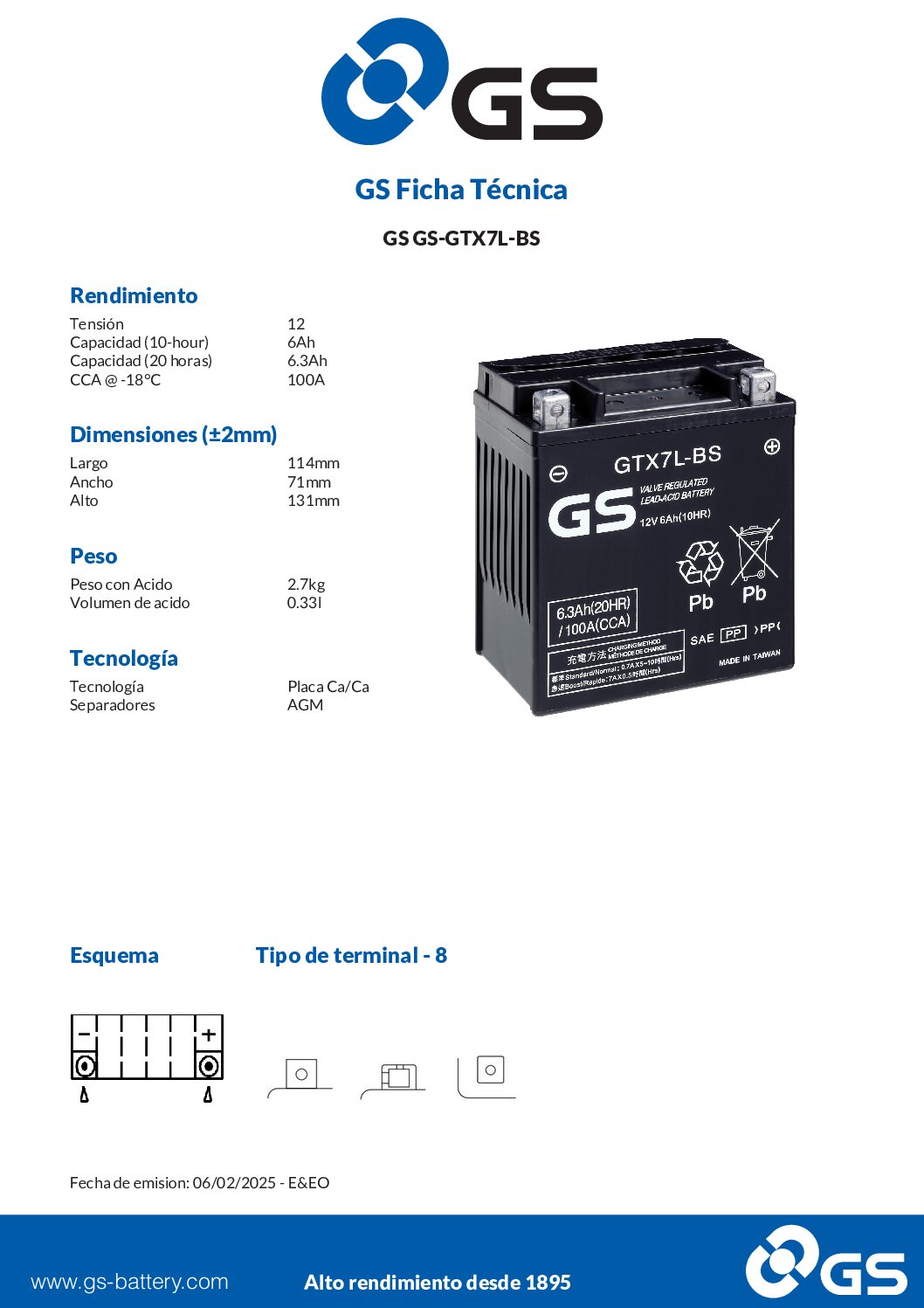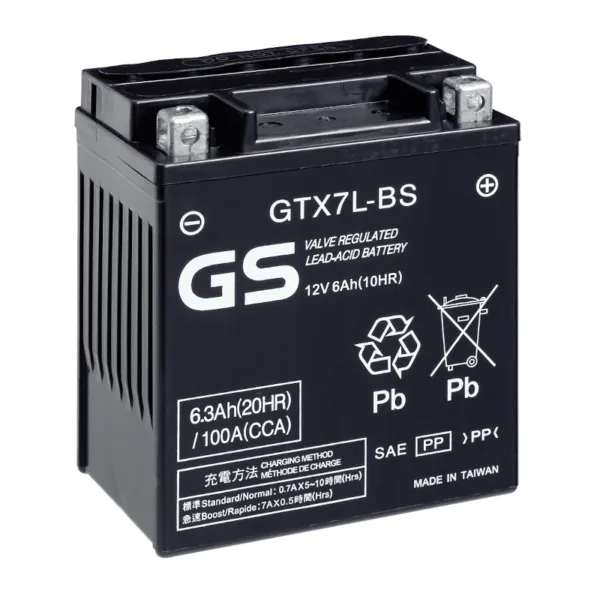 GS YTX7L-BS, batería sin mantenimiento, tipo AGM.