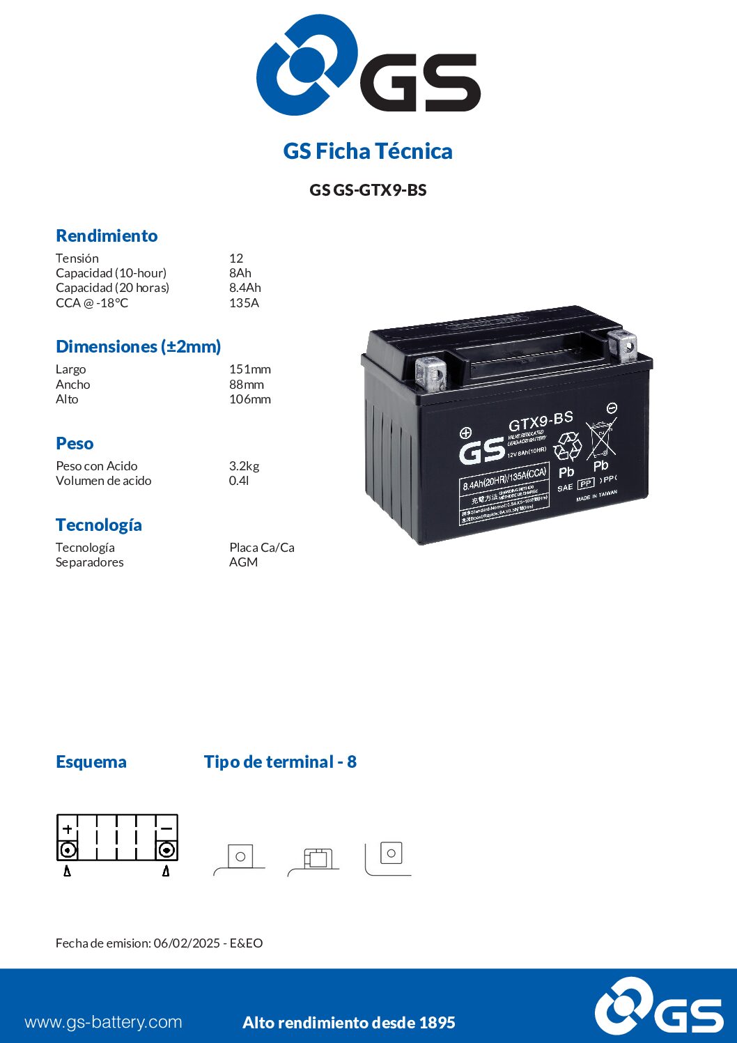 GS YTX9-BS, batería sin mantenimiento, tipo AGM.