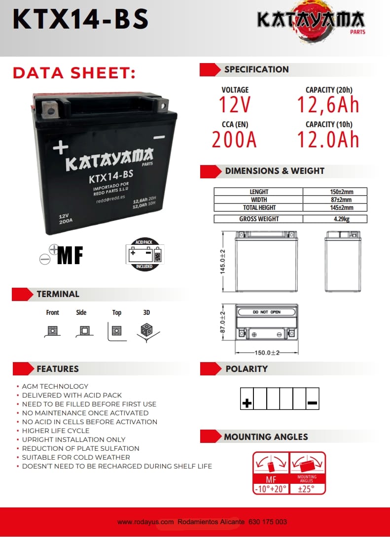 La batería YTX14-BS está 100% sellada y no necesita mantenimiento una vez activada, lo que mejora su vida útil y su resistencia a las condiciones más duras.