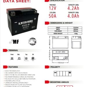 Batería KTX4L-BS – YTX4L-BS forma parte de nuestra gama sin mantenimiento. Especialmente diseñada para ofrecer más comodidad y rendimiento, esta batería de 12V y 4,2Ah viene con un pack de ácido y debe ser activada antes del primer uso.