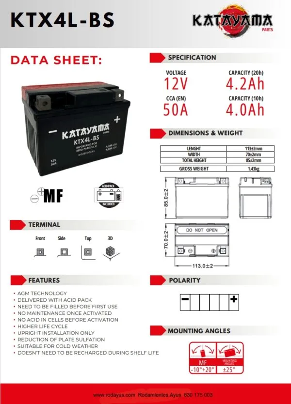 Batería KTX4L-BS – YTX4L-BS forma parte de nuestra gama sin mantenimiento. Especialmente diseñada para ofrecer más comodidad y rendimiento, esta batería de 12V y 4,2Ah viene con un pack de ácido y debe ser activada antes del primer uso.