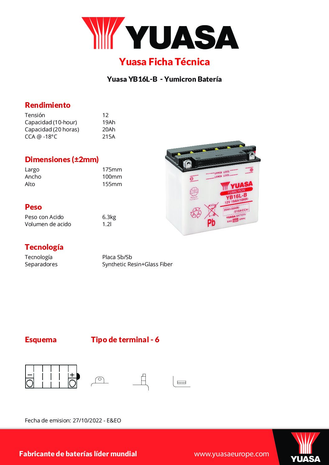 Yuasa YB16L-B, es una marca ubicada en Japón que fabrica principalmente baterías siendo uno de los líderes mundiales en baterías de alta gama para motos.