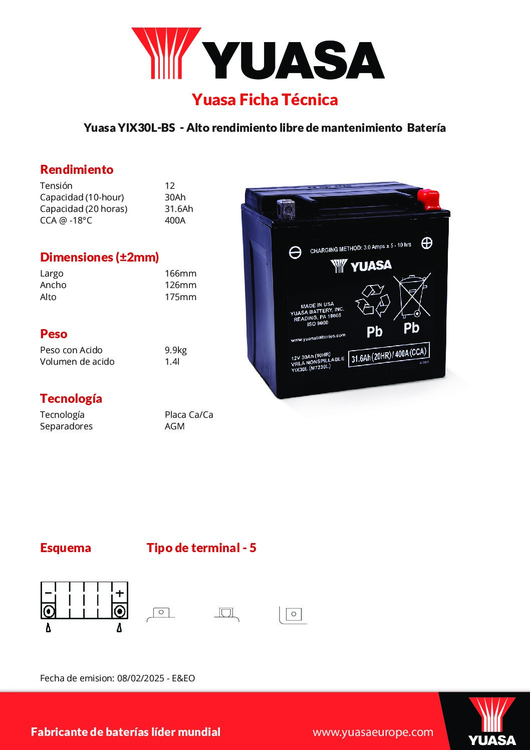 Batería YIX30L-BS YUASA, sin mantenimiento, tipo AGM.