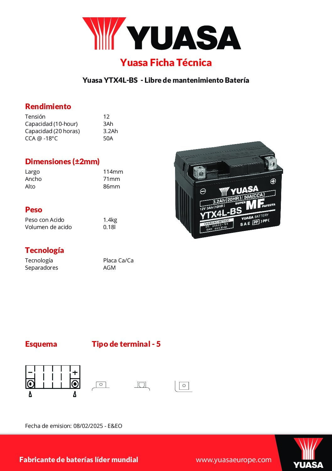 Batería YTX4L-BS YUASA, sin mantenimiento, tipo AGM.