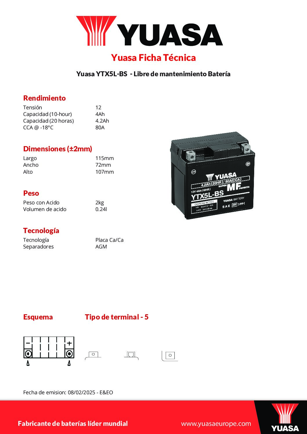 Batería YTX5L-BS YUASA, sin mantenimiento, tipo AGM.