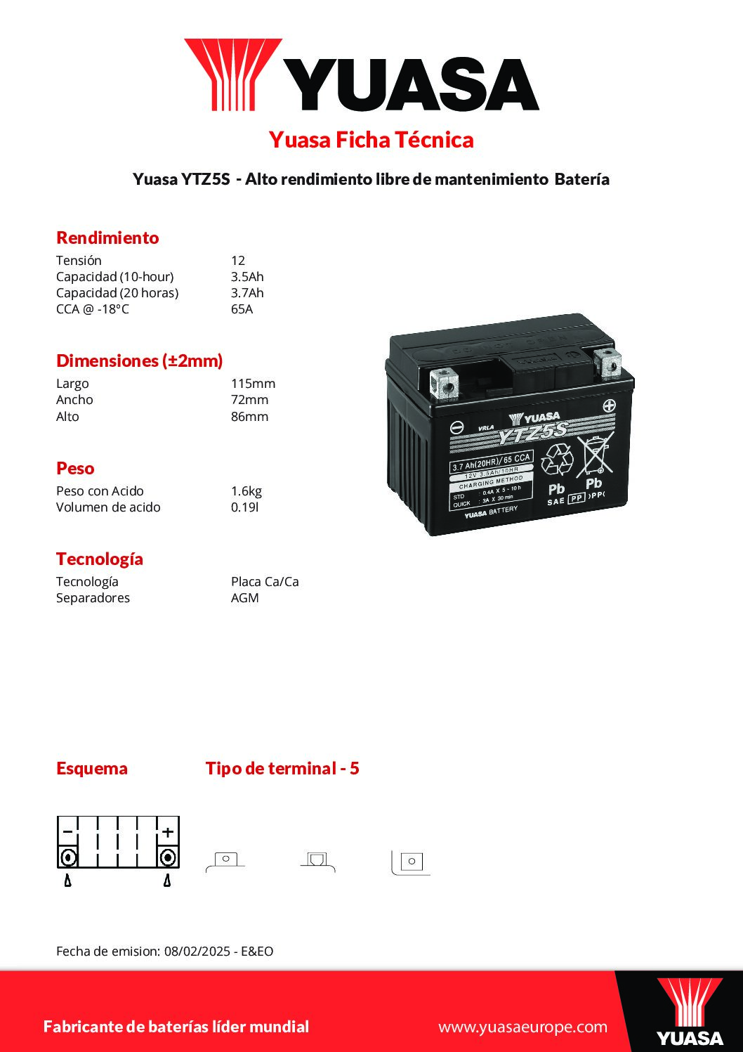 YUASA YTZ5S GEL, batería sin mantenimiento.