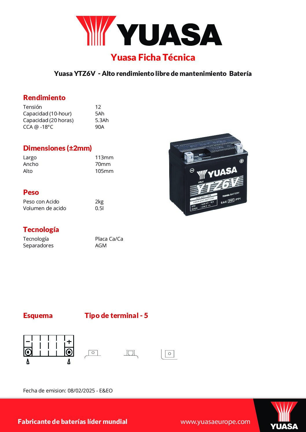 YUASA YTZ6V-BS, batería sin mantenimiento.