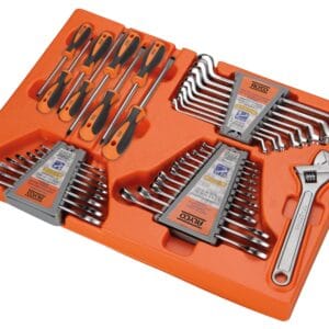 1. Juego de 8 llaves fijas de doble boca, juego de 12 llaves combinadas, juego de 8 llaves de doble estrella acodadas, 8 destornilladores y 1 llave inglesa.