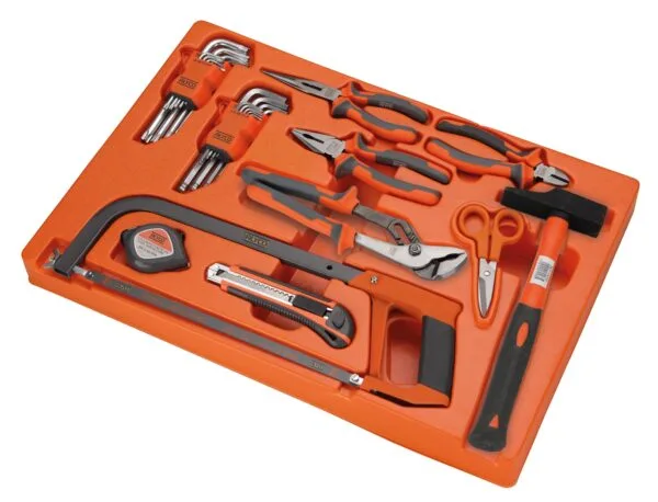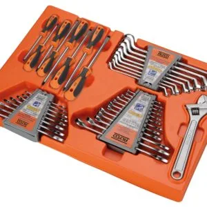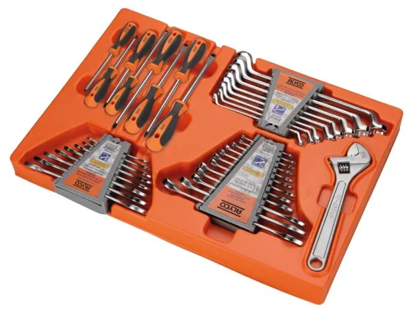 1. Juego de 8 llaves fijas de doble boca, juego de 12 llaves combinadas, juego de 8 llaves de doble estrella acodadas, 8 destornilladores y 1 llave inglesa.