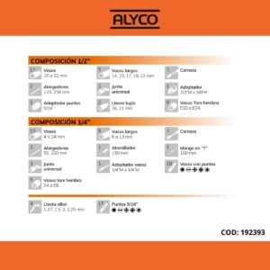 -Composición 1/2”: 17 vasos (10 a 32 mm) / 5 vasos largos (14, 15, 17, 19, 22 mm) / 1 carraca con inversor y expulsor de vasos de 72 dientes / 2 alargaderas (125, 250 mm) / 1 junta universal / 1 Adaptador (1/2”M x 3/8”H) / 1 adaptador de puntas (5/16”) / 2 llaves bujía (16, 21 mm ) / 17 puntas 5/16” / 4 llaves allen (1.27, 1.5, 2, 2.5 mm.) / 8 vasos torx hembra (E10 a E24).