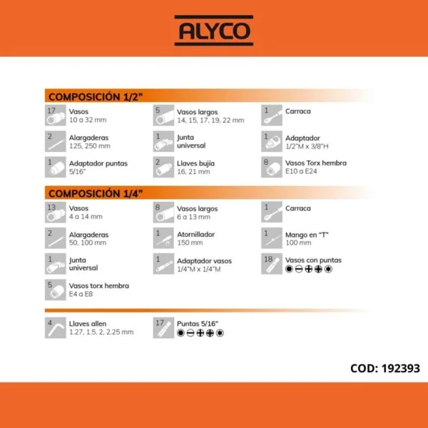 -Composición 1/2”: 17 vasos (10 a 32 mm) / 5 vasos largos (14, 15, 17, 19, 22 mm) / 1 carraca con inversor y expulsor de vasos de 72 dientes / 2 alargaderas (125, 250 mm) / 1 junta universal / 1 Adaptador (1/2”M x 3/8”H) / 1 adaptador de puntas (5/16”) / 2 llaves bujía (16, 21 mm ) / 17 puntas 5/16” / 4 llaves allen (1.27, 1.5, 2, 2.5 mm.) / 8 vasos torx hembra (E10 a E24).