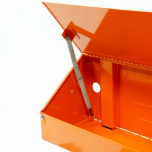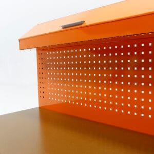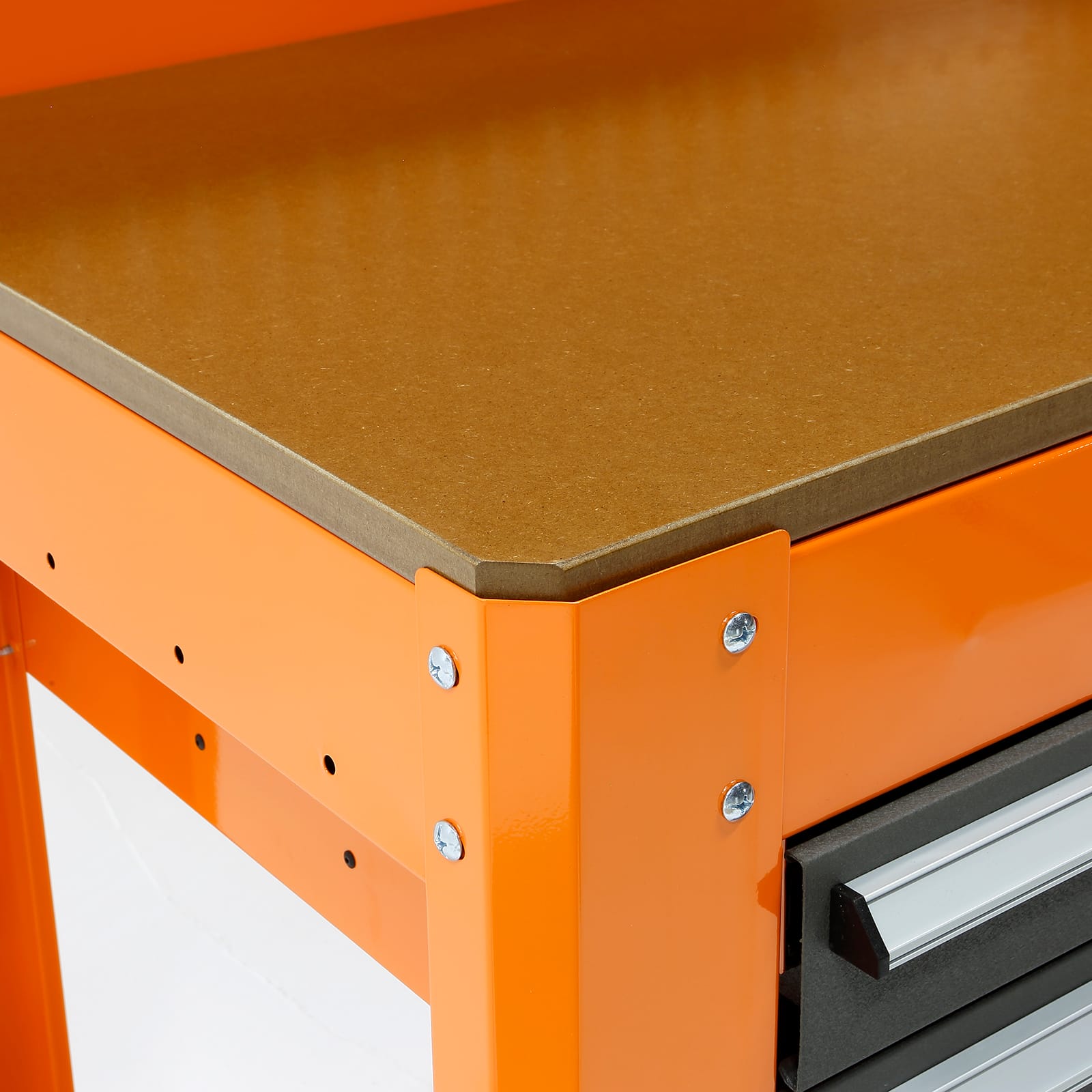 Magnifica mesa de trabajo metálica superficie de madera MDF, panel para herramienta metálico y compartimiento superior de almacenaje, Alyco Orange 170798.