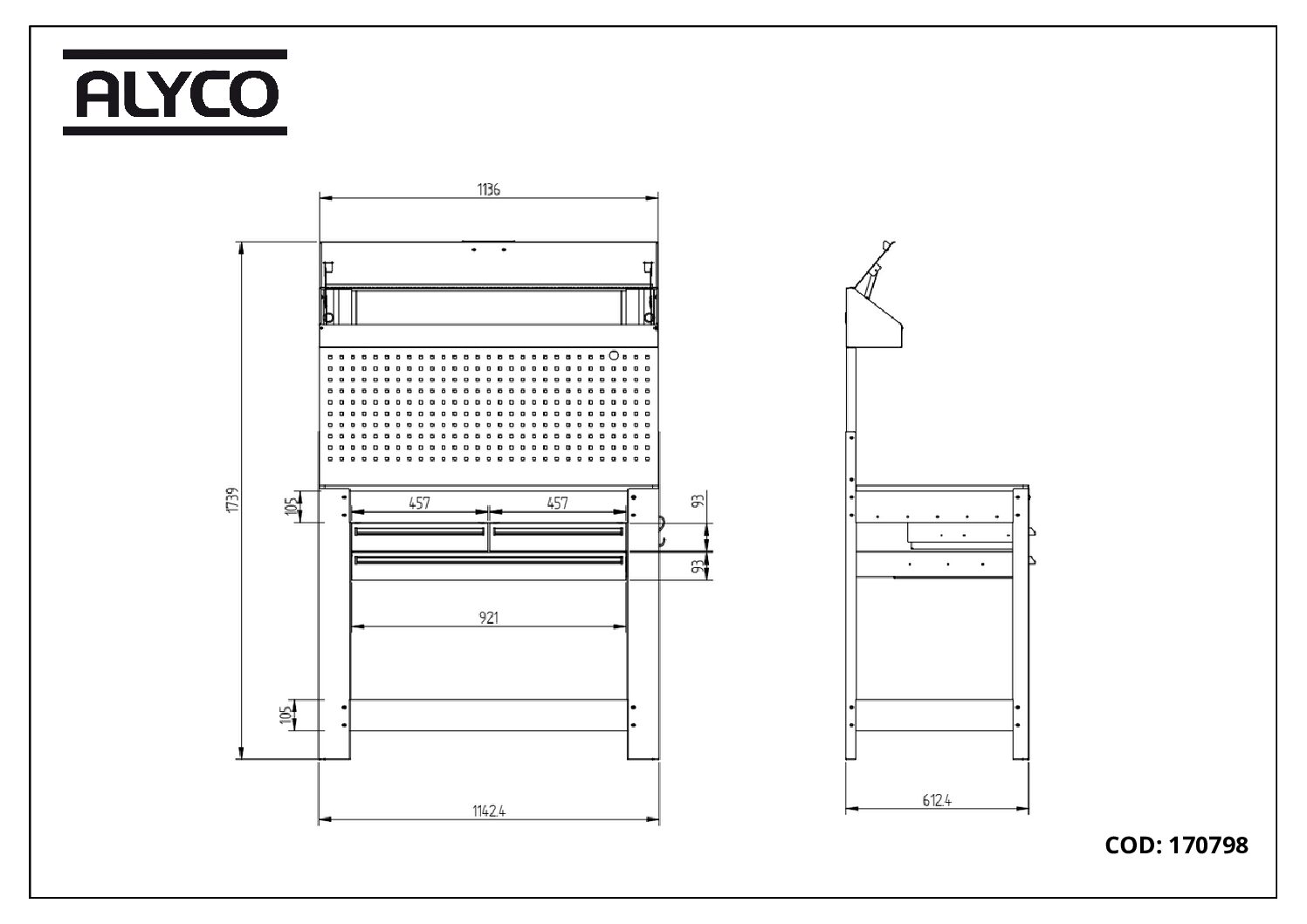 Con 3 cajones, una superficie inferior para dejar herramientas, un compartimento superior para herramientas y un panel perforado para ganchos con posibilidad de colgar herramientas o complementos (ganchos no incluidos, se venden por separado ref. 113499). 4 patas muy robustas.