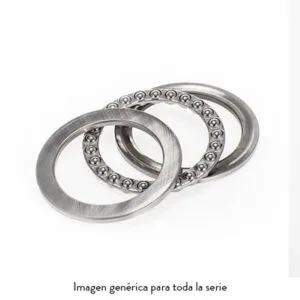Rodamiento FAG 51211 axial de bolas simple efecto. Construido en varias piezas, una central de bolas de chapa de acero y dos laterales, con ranuras de rodadura para las bolas, y sujeta la parte central.